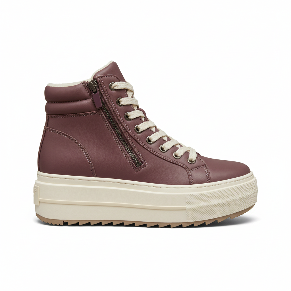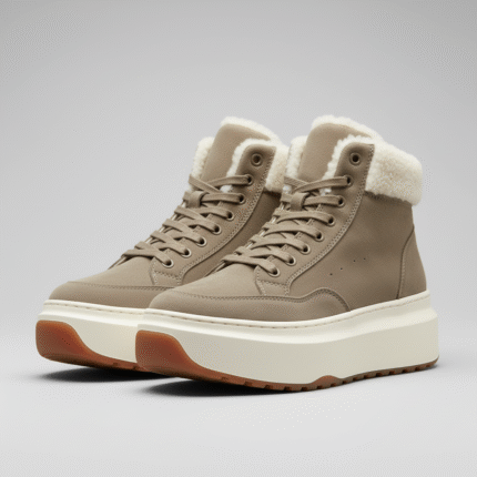 Feel the rich, resilient embrace of the olive green canvas, built to accompany your daily adventures without compromising on your distinctive style. The luxurious terracotta sherpa collar isn’t merely an accent; it’s a thoughtful embrace for your ankle, providing warmth and softness that truly sets these apart. Below, the substantial cream platform midsole and reinforced rubber toe cap expertly fuse fashion with function, offering a resilient foundation and comfortable lift that carries you through your day. Every gold-toned eyelet and precision stitch speaks to a meticulous craftsmanship, ensuring these sneakers are not just worn, but cherished for their exceptional quality and enduring design.